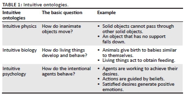'Intuitive ontology' is a limited set of our evolved expectations that emerged in early childhood, guiding our reasoning about physical, psychological and biological phenomena (De Cruz 2014:489). It is 'intuitive' in the sense that it is not the product of deliberate reflection or scientific or philosophical research. In other words, these intuitive expectations are inherent in our minds, activated in us from an early age and always accompany our other beliefs and reasons. For example, suppose someone is trapped in a room with metal walls. If he or she argues that he or she cannot escape the room, all humans will find this reason compelling because they know by their 'intuitive physics' that it is not possible for a solid object to pass through another solid object. Table 1 presents some examples of intuitive ontologies.