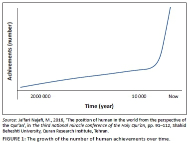 It became clear that 'Adam's Istifā' is a genetic selection over his fellow contemporaries and is based on scientific evidence, in terms of anatomy, skeletal structure, brain size and volume, physical strength and other structural features, early humans did not differ significantly from modern humans. However, it seems that early humans before homo-sapiens were relatively less developed in terms of the capacity of thinking, reasoning and wisdom. In fact, despite being generally smarter than the other species of their time and exhibiting behaviours similar to those of modern humans, early humans were remarkably disadvantaged in terms of behaviour and reasoning. If we consider the diversity and number of achievements by all the early human species, including the discovery and use of fire, the manufacturing of stone tools, animal hunting, painting, spear making, migrating, exchanging, making and using signs and symbols, making jewels from stones and bones and so on from about 2 million years to 10 000 years ago, coinciding with the extinction of all early human species as well as the achievements by more intellectually developed, modern humans until now, including all the various sciences, different languages, complex economic and social structures and so on (Franklin & Habgood 2007; McBrearty & Brooks 2000; McCollister 1989), we will come up with a result similar to the one presented in Figure 1 (Ja'fari 2016).