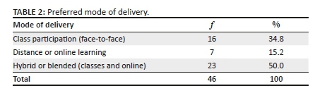 The participants shared their views regarding the preferred mode of delivery for studying at the Faculty of Theology and Religion at UP (see Table 2). However, this question was not asked at the NWU; thus, no comparison could be made.