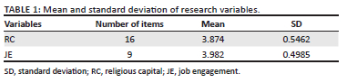 Upon distributing the questionnaires among 2500 Muslim nurses at Kuala Lumpur and Penang hospitals, Malaysia, 2384 completed questionnaires were returned and the rest were excluded from the data analysis. The findings regarding the demographic characteristics also revealed that 54% of the nurses were female and 46% were male. In terms of the level of education, 68% of the respondents had a bachelor's degree, and 29% and 3% of the individuals held a master's degree or a PhD degree, respectively. The nurses' maximum age range here was estimated to be 36. The mean and standard deviation (SD) for the research variables are illustrated in Table 1.