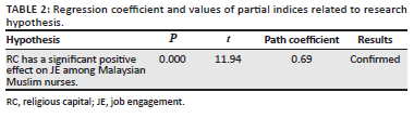 Taking account of religion with a more general approach beyond the existing ones and with a natural and moral aspect, beyond the rituals and customs as the inner spirit and content of all heavenly religions, it is concluded that religiosity promotes justice, fair pay, higher ethical standards and piety; it encourages good deeds and discourages evil ones; it respects equality, brotherhood, etc., all of which can increase JE (p = 0.8, t = 11.94). However, the effects of religion on the quality of believers' behaviour go beyond job satisfaction. As the present study investigated the effect of RC on JE among Malaysian Muslim nurses during the COVID-19 pandemic, the theoretical logic of confirming the research hypothesis implied that nurses could benefit from higher JE by bolstering RC.