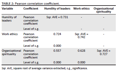 As shown in Table 2, all correlations had values less than 0.85, so the existence of multiple common linear relationships between variables is ruled out. The highest correlation coefficient between the two variables of leaders' humility and work ethic (0.774) is at a strong level, and the lowest correlation coefficient between the two variables of leaders' humility and work ethic (0.557) is above average.