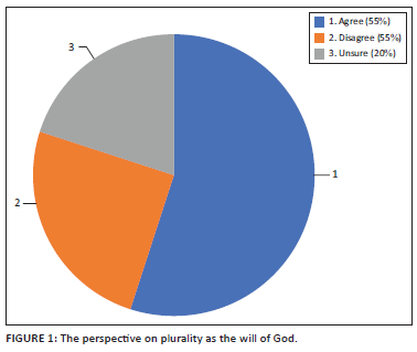 The chart in Figure 1 illustrates the percentage of various respondent answers. Fifty-five percent of the respondents perceive plurality as part of law of nature, which naturally occurs by the will of God and is not a product of personal design or influence from institutional social power. It demonstrates that the majority of the respondents accept plurality as an inevitable and constant social reality. Nature will always comprise a macrocosm of religions, ethnicities, genders and races (Birch 2018:85-102; Goossaert 2014; Hanson 2016). Based on further inquiries towards respondents, they defy a perspective that Cohen and Numbers refer as denomination: a tradition of singularity in religion (Cohen & Numbers 2013).