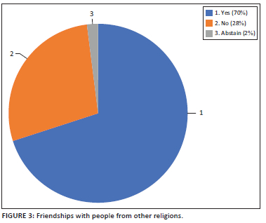 The survey result reveals that the majority of the respondents has colleagues from different religions. A total of 353 respondents admit to have formed friendship with people with different faith, whereas 144 respondents state that they do not have friends with different faith and the rest 10 respondents abstain (see Figure 3).