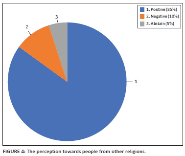 Based on the given data distribution, interactions between respondents and people from different religions are common. It leads to a presumption that those interactions may influence their perspectives towards various aspects. The contiguity with people with different faith induces a complex effect within themselves (Hermisson, Gochyyev & Wilson 2019:371-387; Sanchez & Gilbert 2016:313-333). Another set of data proves this notion where it reveals respondents' perception towards people from different religions. A total of 1105 respondents perceive them positively, while 65 respondents see them negatively, and 30 respondents choose to abstain (see Figure 4).