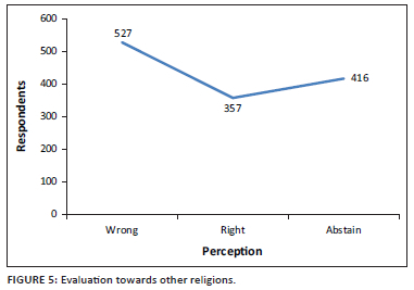 In the concern of evaluating the rightness of other religions, the majority of the respondents perceive that other religions are wrong. The number amounts to 527 respondents (see Figure 5). The majority corroborates their belief on the basis of verse 19 in the third chapter of Quran, chapter Ali Imran, which reads that the only religion acknowledged by God is Islam. The reason of formulating their reasoning based on a Quran verse is because the holy book has a powerful influence in shaping their perception towards other religions. On the other hand, 357 respondents perceive that other religions are right. The majority of them who claim so reason that other religions stem from the same God.