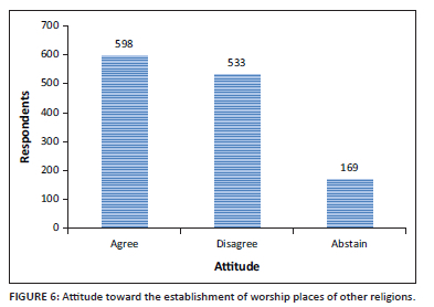 The next data demonstrate that 56% of the respondents agree with the establishment of other religions' places of worship in their neighborhood, while 41% of the respondents disagree and 13% abstain (see Figure 6).
