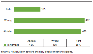 The number of respondents who abstain in this topic is relatively high, viz. 416 students. Based on the confirmation process and further inquiries, these respondents argues that the question concerns the realm of aqida (Islamic creed); hence, they answer the question with caution. They believe that they are spared from making a mistake apropos of the religious creed by choosing not to give any assessment towards other religions.