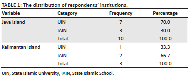 Table 1 shows that the respondents' institutions are divided into two forms of higher education institutions, namely universities and high schools. The respondents on the island of Java mostly come from universities, while the number of respondents from high schools is less.