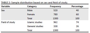The total number of population in this study is 217 000 students, which is further categorised into two, viz. students from study programmes concerning Islamic studies and students from general study programmes. The final sample number of 1300 questionnaires is based on a stratified sampling from a database of 1400 questionnaires. The surveyed respondents were randomly and proportionally selected to represent 13 state Islamic higher education institutions. Respondent profile has two categories, namely sex and field of study. Meanwhile, there are two categories of colleges: State Islamic University (UIN) and State Islamic School (IAIN).