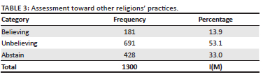 The answer categories for the topic of assessment on the practices of other religions splits into three: believing, unbelieving and abstain. The answer with the highest frequency from respondents is that they do not believe in the practices of other religions. The percentage shows that 53.1% of the respondents claim that the practices of other religions are wrong after having been asked. Only 13.9% of the respondents answer that the practices are right, while the number of people who abstain amounts to 33% (see Table 3).
