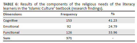 According to Table 6, the total frequency of the components of the religious needs of the literacy learners in the 'Islamic Culture' textbook content is 371. Among the dimensions of the religious needs of these learners, most attention was paid to the cognitive dimension and the least attention was to the emotional one.