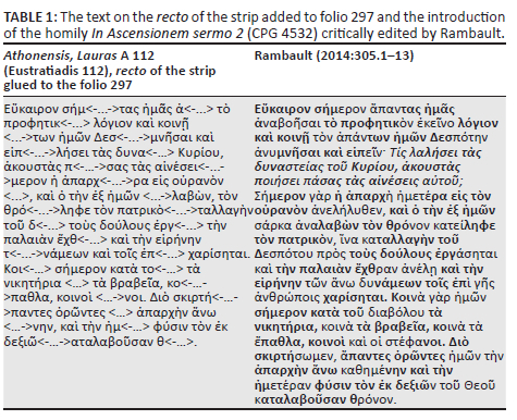 The text that can be discerned on the recto of the strip glued to the edge of folio 297 is the beginning of a homily. Although some of the letters are not legible due to the mutilation of the strip, it is possible to discern the following title: Τοῦ ἐν ἁγίοι<ς> Ἰω<άννου> τοῦ Χρ<υσοστόμου> εἰς <τὴν> ἀνάληψιν τ<οῦ Κυρίου> ἡμῶν Ἰ<ησο>ῦ Χ<ριστο>ῦ. Further on the it is possible to read: Εὔκαιρον σήμ<-…->τας ἡμᾶς ἀ<-…> τὸ προφητικ<-…> λόγιον καὶ κοινῇ <…->των ἡμῶν Δεσ<-…->μνῆσαι καὶ εἰπ<-…->λήσει τὰς δυνα<-…> Κυρίου, ἀκουστὰς π<-…->σας τὰς αἰνέσει<-…->μερον ἡ ἀπαρχ<-…->ρα εἰς οὐρανὸν <…>. Both the title and the incipit of the text allow us to identify the homily as In Ascensi onem sermo 2 (CPG 4532), which has recently been critically edited by Nathalie Rambault (2014:263-322). The text preserved on the recto of the strip is none other than this homily's introduction (see Table 1). Furthermore, it is possible to observe that the fragment shares most of its variant readings with the manuscripts Parisinus gr. 766 (mid-9th century) (P), Hierosolymitanus S. Sepulcri 6 (10th century) (Y), Vindobonensis theologicus gr. 5 (dated 948) (F), Monacensis gr. 146 (11th century) (M), Pantocra toros 26 (11th century) (K), Parisinus gr. 1175 (11th century) (J), Marcianus gr. II.46 (13th century) (G). In terms of content, the homily begins with a burst of joy in an almost hymnographic style and sums up in a few formulas the importance of Christ's Ascension in the economy of salvation. The author of the homily exclaims that the feast of the Lord's Ascension is a fitting time to praise Christ, the Lord of all, in hymns, because: