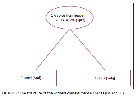 On the second level of this diagram, we have operations of the blending by means of identity descriptions. Thus, there is the prophetic (P1) space whose subject-predicate relations in the form X is n of Y are somewhat reflected in the witness contexts FA1 and FB1. For example, in Isaiah 42:1, the servant is the chosen of YHWH and in Matthew 3:17, the baptism candidate is the beloved Son of the Voice from heaven.