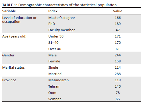 This research was conducted with the aim of determining the effect of transparent governance based on the teachings of Nahj al-Balagha on the social trust of Iranian Muslim citizens in 2022. For this purpose, 428 Iranian Muslim citizens were selected as the statistical population, using convenience sampling. After distributing the questionnaires, 402 persons were found appropriate and the rest were excluded from the analysis (because of the lack of correct completion). The demographic characteristics of the statistical population are provided in Table 1.