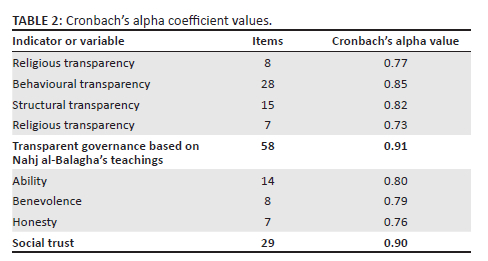 To measure transparent governance based on the teachings of Nahj al-Balagha, the 58-item questionnaire developed by Rastgar and Mousavi Davoudi (2022) was administered. This could evaluate transparent governance based on four indicators, namely religious transparency, behavioural transparency, structural transparency and economic transparency. The 29-item questionnaire designed by Yaqoubi (2011) was additionally used to reflect on social trust, via three indicators of ability, benevolence and honesty. Cronbach's alpha coefficient in the Statistical Package for the Social Sciences (SPSS; IBM Corporation, Armonk, New York, United States) was further used to measure the reliability of the research tool, whose results are listed in Table 2.