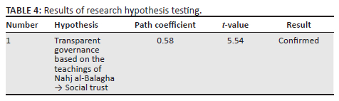 The structural equation modelling (SEM) outcomes are illustrated in Table 4 and Figure 1, indicating that transparent governance based on the teachings of Nahj al-Balagha has a significant positive effect on social trust among Iranian Muslim citizens.