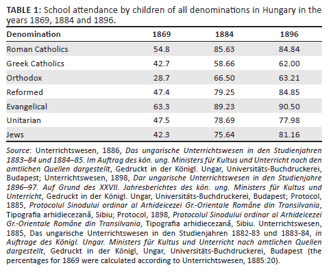 The development of school attendance by children of all denominations in Hungary can be traced in Table 1 (Brusanowski 2010a:I, 335; Unterrichtswesen 1886:24, 1898:152).