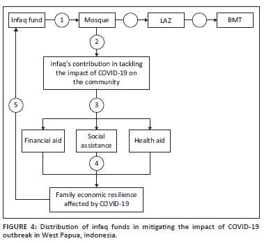 In line with that, the role of the Islamic economy is required to make a maximum contribution to tackling the impact of the COVID-19 pandemic (Ascarya 2021; Hafizah 2021). Infaq, a key instrument of Islamic economics, can reduce and alleviate community poverty (Malik & Hussain 1994). Not only in West Papua Indonesia but also in other developing Islamic countries that have vulnerability in the social-economic aspect. This infak fund can be an option for protecting and providing guarantees for the social-economic resilience of the community (Riyanto, Nizar & Herningtyas 2021). The method is undoubtedly different for each region or country, generally by distributing infaq funds to non-profit institutions that are trusted to manage people's funds, so that the technicalities remain in accordance with Islamic procedures (Abidin & Sukmana 2022; Ramli & Jalil 2013; Sholihah & Zaenurrosyid 2021). In the end, infaq can contribute to the community's benefit (Aziz 2021) to social independence (Hidayati et al. 2020). Therefore, the government and various parties can work together to raise the community's social-economic impact during the COVID-19 pandemic using infaq funds as a strategic instrument.