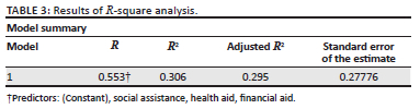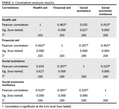 Based on the output table of bivariate correlation analysis (Table 1), it can be interpreted that: firstly, the value of Sig. (two tailed) between the predictor of health assistance and social-economic resilience of 0.000 < 0.05, there is a strong relationship between health assistance and the socio-economic stability of communities affected by COVID-19. Secondly, the value of Sig. (two tailed) between the predictor of financial aid and social-economic resilience of 0.000 < 0.05, there is a strong relationship between economic assistance and communities affected by COVID-19. Thirdly, the value of Sig. (two tailed) between the predictor of social assistance and social-economic resilience of 0.000 < 0.05, there is a strong relationship between social service and the social-economic resilience of communities affected by the COVID-19 outbreak.