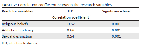 According to Table 2, the correlation coefficient of AT and ITD in the Muslim couples applying for divorce was r = 0.66, which was significant at the 0.001 level. As well, the correlation coefficient of SD and ITD was r = 0.54, which was assumed significant at the 0.001 level. In other words, there was a positive correlation between AT and SD and ITD.