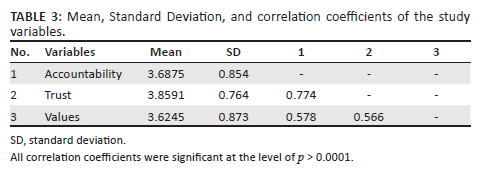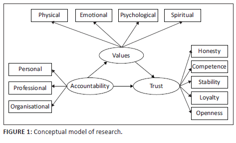 Today, the ever-increasing complexity of organisations and the growth in the volume of unethical and illegal activities in the workplace have made it necessary for managers and employees to pay much attention to the development and maintenance of professional ethics, responsibility and social accountability in all organisations (Widyarini & Muafi 2021). Ethics, responsibility and accountability, defined as philosophical values and dos and dont's, and the criteria for measuring the correctness and wrongness of behaviour towards oneself, others and society, are thus among the topics that have drawn the attention of scholars and experts over the last decades. Responsible behaviour is accordingly one of the indicators of a healthy person in any society. Based on this, addressing accountable and responsible managers is an essential reality for realising the goals of government organisations as an organisational priority and providing the grounds for such basic behaviours in the organisation and among managers and employees. On the other hand, values are one of the main factors shaping employees' accountability and trust, as the basis of all the activities in organisations. Values accordingly help to establish and maintain standards that can influence people to take desirable actions in organisations. In particular, organisational success, accountability and trust are fostered when values are widely shared among members (Parboteeah, Paik & Cullen 2009). From this perspective, this study aimed to investigate the mediating role of values in the relationship between accountability and trust among Muslim managers and employees in Islamic organisations in Iraq in 2022.
