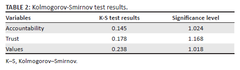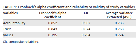 This applied research was carried out using a descriptive method (viz. field study and survey). The statistical population included 2500 senior government managers and employees of 50 service organisations (including education, restaurant, hotel, insurance, and banking and finance) in Baghdad, Iraq, in 2022. In this study, library and field methods were utilised to collect the data. For this purpose, the library method was recruited to review the related literature and the background, while the data were collected by referring to Iraqi government organisations and distributing questionnaires among senior managers and employees in the field method. The research instruments consisted of the nine-item questionnaire developed by Izadi Fard and Kaviar (2010) to measure accountability in three dimensions, namely individual, professional and organisational ethics; Robbins' questionnaire (2003) to measure trust in five dimensions (namely honesty, competence, stability, loyalty, and openness), containing 15 items; and the 12-item questionnaire validated by Suppiah and Sandhu (2011) to determine values in four dimensions (i.e. spiritual, psychological, emotional and physical), based on the Likert-type scale, ranging from completely disagree to completely agree. Among the numerous methods to settle the validity of the measurement instruments, face validity and content validity were utilised in this study. The research instruments were further presented to some university professors, and they confirmed its validity and relevance. In this study, Cronbach's alpha coefficient and composite reliability (CR) were also exercised to measure the reliability of the questionnaire, whose results are given in Table 1.