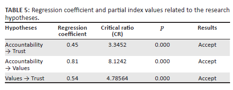 To test the significance of the research hypotheses, two indices, CR and p-value, were utilised. Based on the significance level of 0.05, it needed to be greater than 1.96, so the value of the parameter lower than this was not considered of great magnitude in the model, and the values smaller than 0.05 for the p-value indicated a significant difference between that calculated for the regression weights and the zero value at the level of 0.95. The SEM and the IBM Statistical Package for the Social Sciences (SPSS) Analysis of a Moment Structures (AMOS) software package was used to test the research hypotheses, whose output is depicted in Table 5.