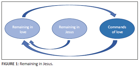 Consequently, we observe a spiral explanation that goes deeper and deeper (growth spiral). The disciples abiding in Jesus means remaining in love. Remaining in love means following the commands of love. Therefore, obeying the commands of love causes the disciples to abide in the love of Jesus (Figure 1).