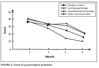 It can be seen from Figure 2 that the impact of teachers' psychological communication ability, psychological understanding ability and psychological guidance ability on students in the psychological ideological and political education curriculum has reached level 4 of the quantitative level, which represents the significance of the significant impact level, that is, teachers' psychological communication ability, psychological understanding ability and psychological guidance ability will have a significant impact on students' psychology. The impact of teachers' ideological and political theory level and psychological strain ability on students in the psychological ideological and political education curriculum has reached the third level of the quantitative level, which represents the significance of the obvious impact level, that is, teachers' ideological and political theory level and psychological strain ability will have an obvious impact on students' psychology. The impact of teachers' psychological analysis ability on students in the psychological ideological and political education course is only level 2 of the quantitative level, which represents the general impact level meaning, that is, the impact of teachers' psychological analysis ability on students' psychological status is not sufficient, and it is only a general impact. From the perspective of system object, that is, students, the changes of students' typical mental health problem scores over time are shown in Figure 3.