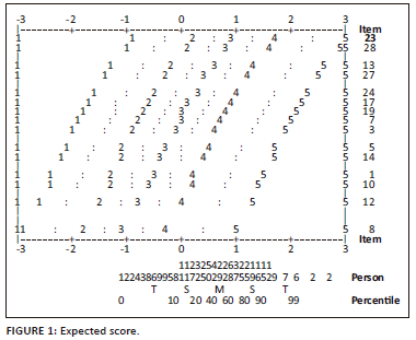 The expected values were well distributed following the Rasch approach. The categories of observations with operational distances for each item corresponded to the distribution of respondents, and the hierarchy of items on the measurement scale demonstrated this. This corresponds to Figure 1.