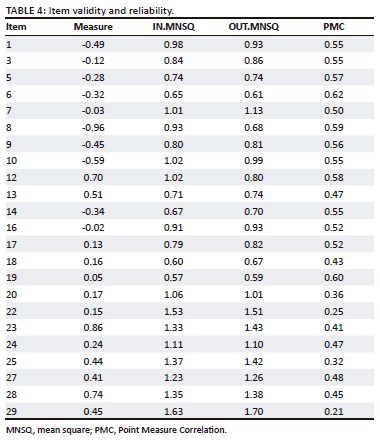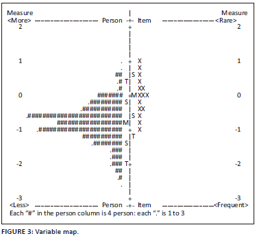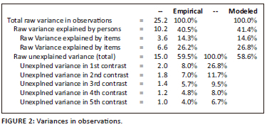 Items and respondents explained the variance in each measurement item according to the Rasch approach. The natural variance explained by size was 100%, as expected in the 100% model. The empirical variance explains 40.5%, which is not much different from what is expected: 41.4%, people 14.3% and expected 14.6%, and items 26.2% and expected 26.8%. The item's natural variance values showing this and the person were 3.6 and 6.6 eigenvalues. The unexplained variance value also reinforces this at the first level, which is not greater than 2 (Larsen & Warne 2010). Further details of the variance are shown in Figure 2.