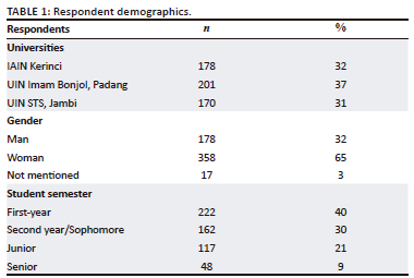 In this research methodology, an online survey approach was used to collect data from 572 Islamic students at three universities in Sumatra, Indonesia. The survey was designed to investigate various aspects related to religious conservatism and their worldview. Firstly, survey preparation involved creating clear and relevant questions, focussing on developing the scale of religious conservatism. An online survey platform was chosen in consideration of its ability to handle a significant number of respondents. A respondent database that included contact information and respondent characteristics was carefully prepared. Thereafter, the online survey was distributed through invitations to respondents with an explanation of the purpose of the research and the importance of their participation (Harlow 2010). The survey results were comprehensively analysed to support the findings of this study in understanding the dynamics of the relationship between these factors in the context of Islamic students in Sumatra. In data context, this study applied the data filtering and cleaning stage by excluding 23 unfit data for further analysis for the following reasons: too many blank answers, the answers were the same between one item and another, and the answers were identical to other respondents. In total, 549 students were included in the final analysis. Samples were selected according to the category and sex of the students. It consisted of 174 men and 358 women, 98 freshmen, 56 sophomores, 73 juniors and 27 seniors (Table 1).