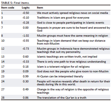 Items were arranged based on three previous studies (Adira et al. 2021; Huber & Huber 2012; Wildman et al. 2021). This unidimensional scale framework produced 29 Indonesian items after the literature review stage, as shown in Table 2.