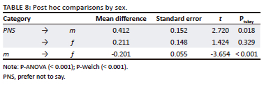 Significant differences existed between gender groups (m, f and civil servants). The probability value with analysis of variance (ANOVA) and Welch is < 0.05 (< 0.001). Each category compared to one other category also shows the significance of the difference: PNS to m (Ptukey = 0.018) and m when f (Ptukey = < 0.001) except civil servant the f (Ptukey = 0.329). The details are listed in Table 8.