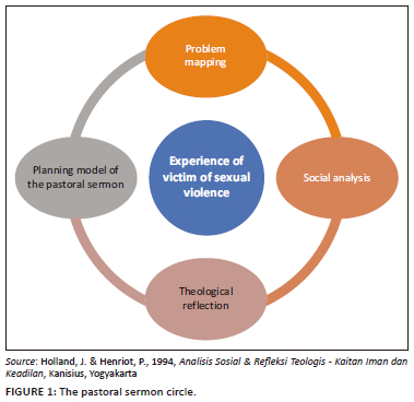 Victims of violence need hospitality Hospitality is needed by victims of violence as a sign of the presence of God's work of salvation (Holland & Henriot 1994). The task of pastoral care is to be God's instrument to heal and guide each person to experience recovery. This approach is called by two terms, namely the 'praxis circle' and the 'hermeneutic circle'. This circle refers to the relationship between four experience factors, namely: (1) problem mapping, (2) social analysis, (3) theological reflection, and (4) planning of the pastoral sermon models. These four elements are displayed in Figure 1, followed by a description of the stages: