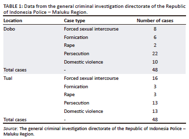 Table 1 shows the data of cases of sexual violence in two district cities, namely, Tual and Dobo sourced from the Directorate of General Criminal Investigation of the Republic of Indonesia Police - Maluku Region.