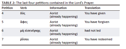 Based on the Greek grammatical structure of the verbs, the last four petitions contained in the Lord's Prayer all use the Aorist form of the verb, namely: (1) δὸς, (2) ἄφες, (3) μὴεἰσενέγκῃς, and (4) ῥῦσαι, all of which show, that all the actions described by the verb 'have taken place perfectly in the past', as can be seen in Table 2.