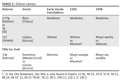 The most common divine names in the Tshivenḓa Bible Translations (1936 and 1998) are Mudzimu, Yehova or Yahavee, Murena, Muṋe wanga, Muṋe washu, and Muṋe wa zwoṱhe (see Table 1).