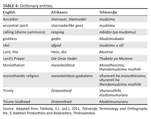 Another book that deserves mention is Tshivenḓa Terminology and Orthography No. 3 (2011) (Tshikota 2011), which was supported by the Department of Basic Education. There are problematic areas with the book, which I would like to highlight. When entries are made, there are three columns: English, Afrikaans, and Tshivenḓa. While this may seem innocent, it is not as it speaks volumes. The starting point for the linguists responsible was not their language; rather, it was English followed by Afrikaans, and then Tshivenḓa. Such an arrangement of a Tshivenḓa terminology book is tantamount to 'inferiorisation' of the Tshivenḓa language. Because English is the starting point, it implies that there are many Tshivenḓa words, which were entered as Tshivenḓa words and are dependent on English words. Furthermore, this leads to linguists choosing to borrow terms from other languages rather than creating terms based on their own language. If this trend continues, what we will end up with is Venḓalicised English. This is no different from what the missionaries did when the Venḓalicised Sepedi which resulted in the distortion of Vhavenḓa religious-cultural worldview. See Table 4 for such entries.
