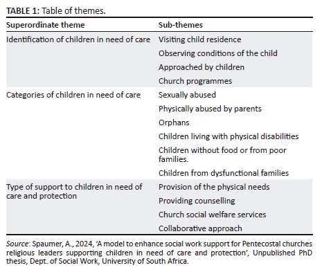Churches are considered one of the important structures responsible for providing care and support to vulnerable populations. One such population are children in need of care and support. This article presents the support provided by Pentecostal religious leaders to children needing care and protection. The study was conducted in Pentecostal churches in Tshwane Metropolitan Municipality, which is found in Gauteng province, South Africa. This qualitative study used an interpretative phenomenological analysis design. Data were collected from nineteen purposively selected leaders in Pentecostal churches using face-to-face semi-structured interviews. Data analysis was guided by the interpretative phenomenological analysis framework for data analysis. Findings indicate that religious leaders within Pentecostal churches are involved in providing care and support to children in need of care. The process they are engaged in include proper identification of those children, attending to physical, psychosocial and spiritual needs. However, each religious leaders use their approach depending on the relationship they have with members of government institutions such as police services and social workers. In order to enhance the support provided the children in need of care and protection, by religious leaders within Pentecostal churches, it is recommended that religious leaders are well informed about the role of different members of multidisciplinary teams such as social workers, psychologists, police officers, parents and other community structures. Moreover, there should be formalised collaboration and referral processes that will ensure that the child's rights are not further violated in the process of provision of support.