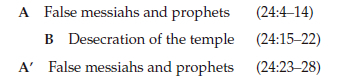 The discussion in Matthew 24:4-31 begins with a description of the events anticipated before the end times (24:4-29), followed by the parousia itself (24:30-31). Verses 24:4-29 are composed of two aspects: tribulations on earth (24:4-28), where Jesus foretells various trials and deceptions that his people will endure and disturbances in heaven (24:29), which depict cosmic events accompanying the end of the age. Talbert presents the tribulations on earth (24:4-28) in an ABA' pattern as follows: