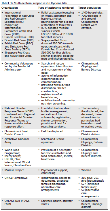 Table 1 shows that the response to Cyclone Idai involved many players from both local and international platforms. It is encouraging that Emmerson Dambudzo Mnangagwa, President of Zimbabwe, declared the Cyclone a national disaster from its onset on 15 March 2019. The President's declaration of the state of disaster gingered National, Regional and Provincial Disaster Response Teams into action. Government and NGOs stood up to the task of managing the disaster.