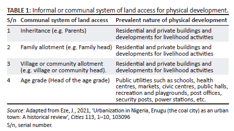 The topic of urban communal land disputes and their effects on access to land for the poor has received significant focus in urban development literature. Land disputes in sub-Saharan Africa, particularly in Nigeria, frequently stem from intertwined land tenure systems, conflicting interests and ineffective governance frameworks (Adekola, Krigsholm & Riekkinen 2023). Researchers have emphasised that communal land ownership, although it offers a sense of identity and safety for traditional communities, frequently turns into a point of conflict as urbanisation elevates the demand for land (Ntumva 2022; Nuhu 2021). In cities like Enugu, these conflicts are exacerbated by the absence of efficient dispute resolution mechanisms and the inclination of government officials to prioritise elite interests instead of addressing the needs of marginalised communities (Uzuegbunam & Nwofia 2014).