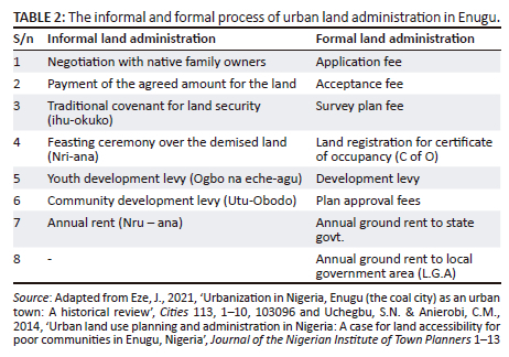 The study revealed that Enugu's land administration operates under a dual framework: the Land Use Act (1978) and the Town and Country Planning Law (1946). Despite these formal mechanisms, the system is quasi-informal, combining formal regulations with informal practices. The Enugu State Ministry of Lands and Urban Development, alongside Local Government Authorities, oversees land administration but their efforts are often undermined by informal community practices. Issues such as outdated frameworks, including the unapproved 1979 master plan, were highlighted. This master plan, while used piecemeal, lacks formal adoption or relevance to current urban needs (Table 1).