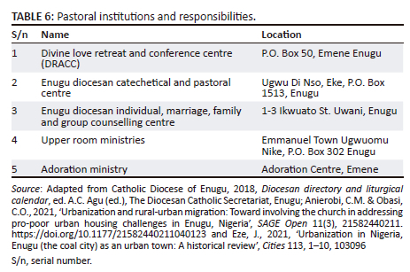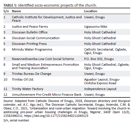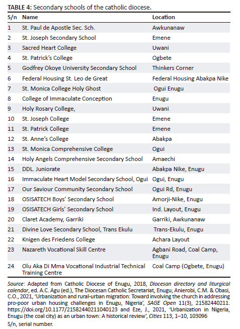 The Church's initiatives are perceived to be guided by its social teachings which advocate for economic justice and equitable resource distribution. A respondent from the education sector observed that 'the Church's schools have not only provided education but also instilled discipline and hope in many families struggling to escape poverty'. The capability of the Church to provide the basic needs and welfare, schools, hospitals and social centres among other institutions, is seen as a strong indication of its intention and ability to help the poor. Some of the institutions established by the Church in Enugu for the welfare of the society are shown in Table 4 to Table 7.