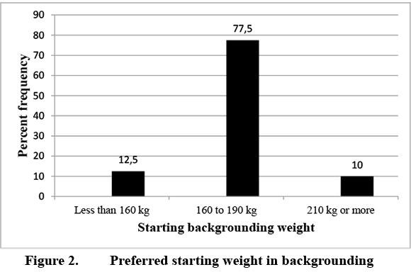 According to the study, most of the respondents (77, 5%) start backgrounding calves from 160 to 190 kg, while 12,5% prefer backgrounding calves at a weight of 160kg or less and 10% at the weight of 210kg or more (Figure 2). Thirty one respondents (77,5%) said they consider calves' breed type because some breeds show a better ADG and FCR than other breeds and 22,5% said they don't consider breed type when buying calves for backgrounding. The latter is due to the fact that they had no choice because they are backgrounding their own calves (stud or dairy calves) and other farmers are buying different breeds in bulk, mostly from the auctions. Strydom, Frylinck, Van Der Westhuizen & Burrow (2008:603) found that the Drakensberger, Tuli and Bonsmara gained weight faster and produced larger carcasses than Brahman (Bos indicus) and the Nguni. They also found no differences in feed conversion ratios (FCR) over an extended period of 131 days among Nguni, Tuli, Drakensberger and Bonsmara (all indigenous breeds).