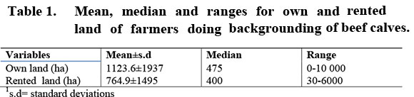 The total number of owned land (ha) ranged from 0 to 10 000 ha, while rented land (ha) ranged from 30 to 6 000 ha (Table 1.). The total ha of the farmers who owned land was 68,1% higher than that of hired land. The farmers doing backgrounding without having a feedlot were 62,5%; those with small feedlots doing backgrounding were 17,5% while those with large feedlots doing backgrounding were 20%. It can also be depicted that 72,5% of the respondent had less than 1000 calves on the farm and farmers with 1000 to 3000 were 12,5% while 15% of the respondents were of the farmers with more than 3000 head of calves.