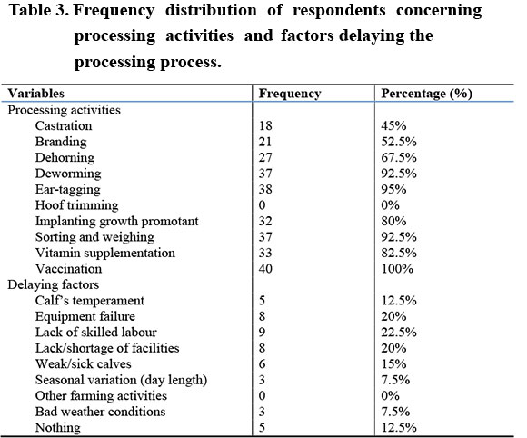 In Table 3 all respondents in this study (100%) indicated that they vaccinate during processing, 95% of respondents indicated ear-tagging, sorting and weighing as well. Deworming was indicated by 92,5% of the respondents while 82,5% of respondents indicated they provide feed supplementation and 80% indicated the implanting of a growth promotant. Loken et al. (2009:1851) used Bovi Shield Gold 5 to vaccinate calves against bovine rhinotracheitis virus, para-influenza 3 virus, bovine respiratory syncytial virus, boviral viral diarrhea virus (type 1 and 2), mannhaemea haemolytica and hemophilus somnus.