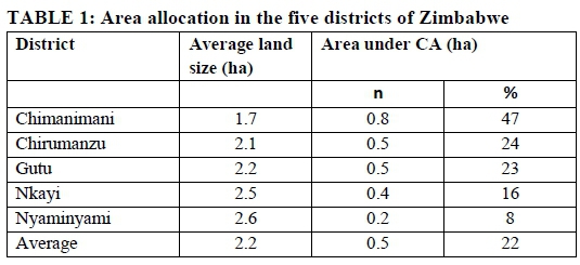 The average field size of farmers in these five districts was 2.2 ha. CA plots were limited to mostly homestead fields which could be fenced and protected from livestock, and the average area in which farmers apply CA principles was 0.5 ha in comparison to conventional tillage, which was practiced on average 1.4 ha (Table 1). As a percentage of total area, CA was practiced on 22% of total arable land while conventional farming practices prevail on 78% of the farms. A further breakdown by districts showed that the highest area allocation to CA was in Chimanimani (47%) and the lowest in Nyaminyami (8%). The low area allocation for Nyaminyami could be due to the low potential for crop production in the Nyaminyami district due to its climate. These findings on the area allocated to CA concur with studies by Ngwira et al. (2014) and Kassam et al. (2014), who report that CA was practiced on approximately 30% of total land holdings in Malawi and in Africa, respectively.